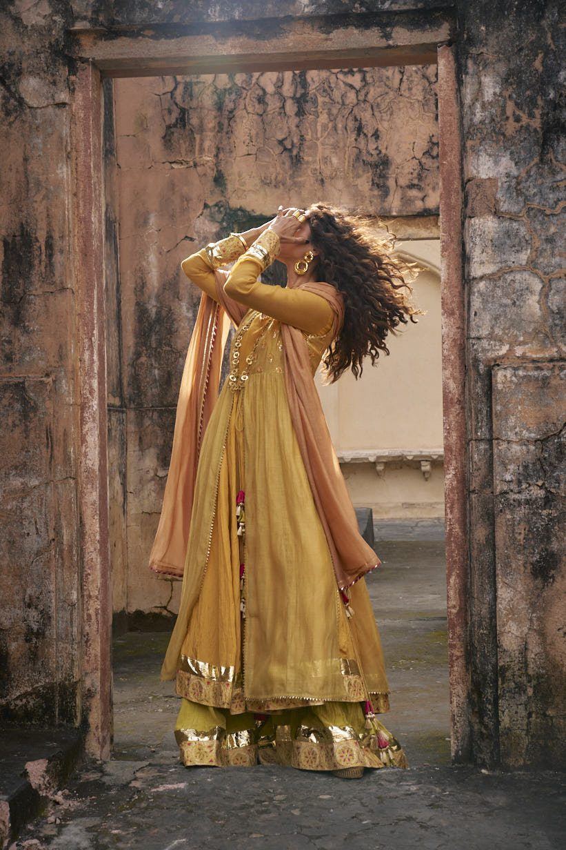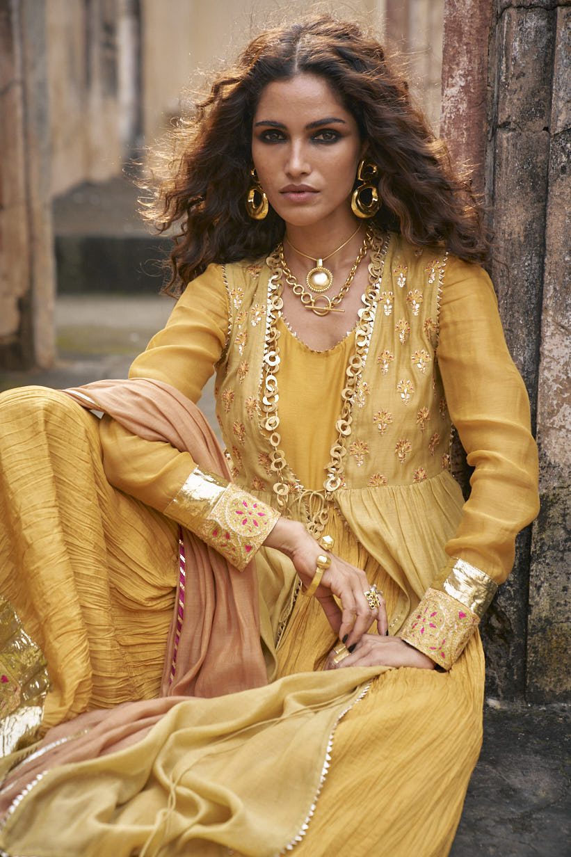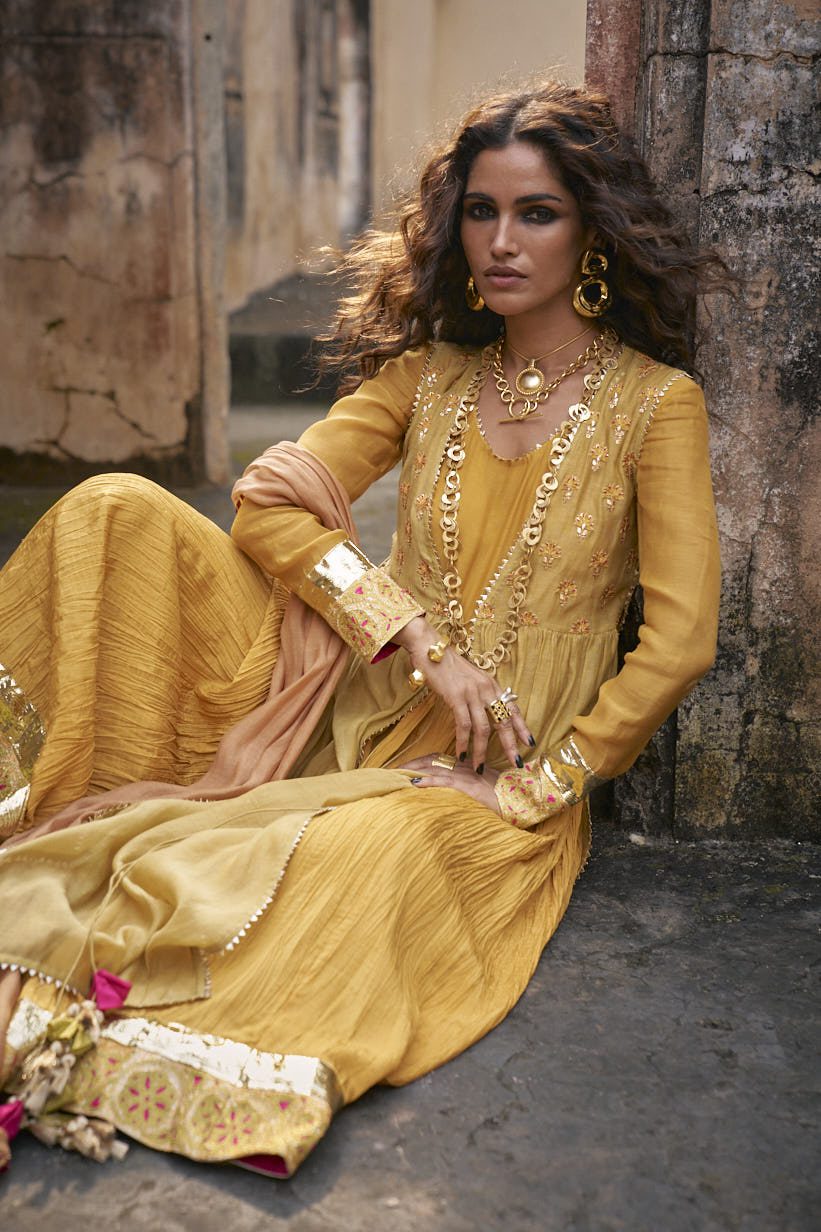 Shirt: Mustard yellow pure cotton silk sleeveless upper shirt with gota work on body and tassels on sides, pure grip silk crushed inner pishwas with thick border of tilla and gota work on gher