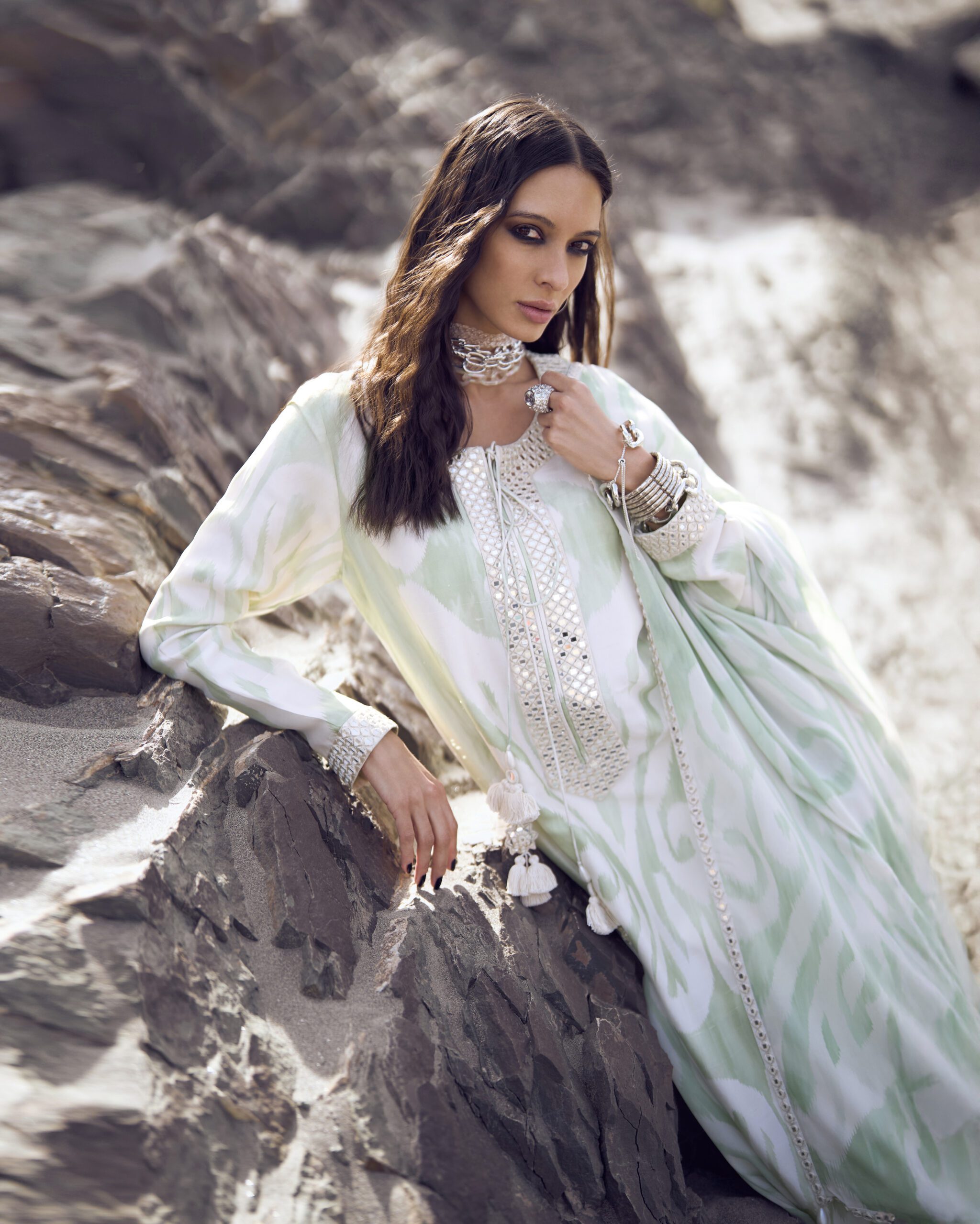 Seafoam green printed long shirt with mirror work and tassels on the neckline paired with ijaar and printed dupatta with four side mirror work and tassels on four corners.