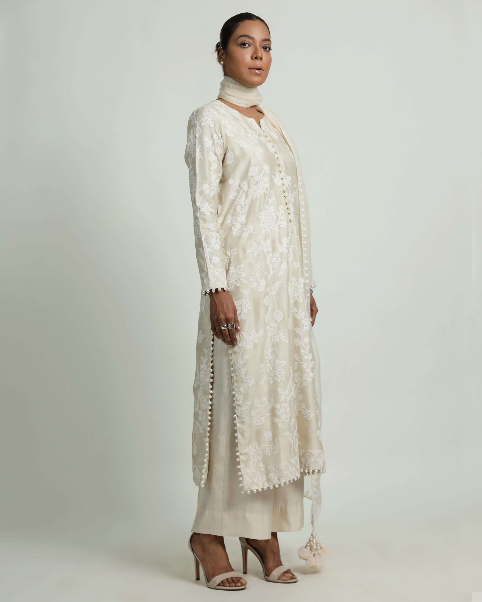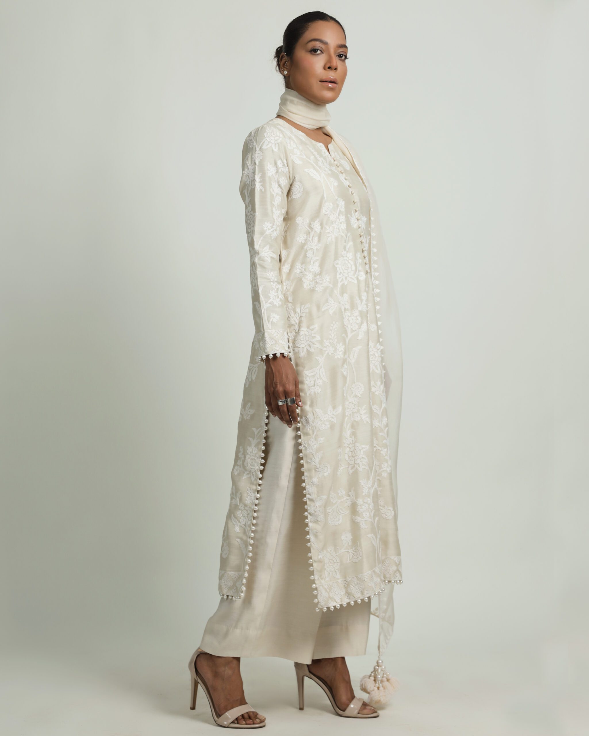 Off white shirt with aari embroidery Off white dupatta with four side aari embroidery and