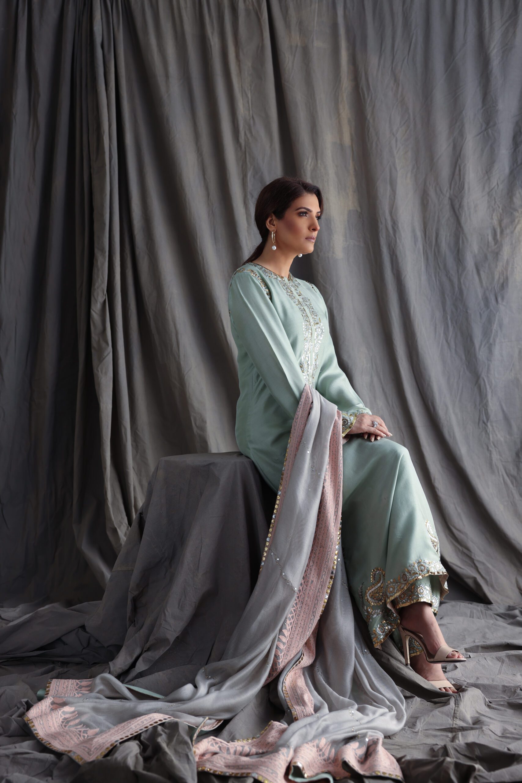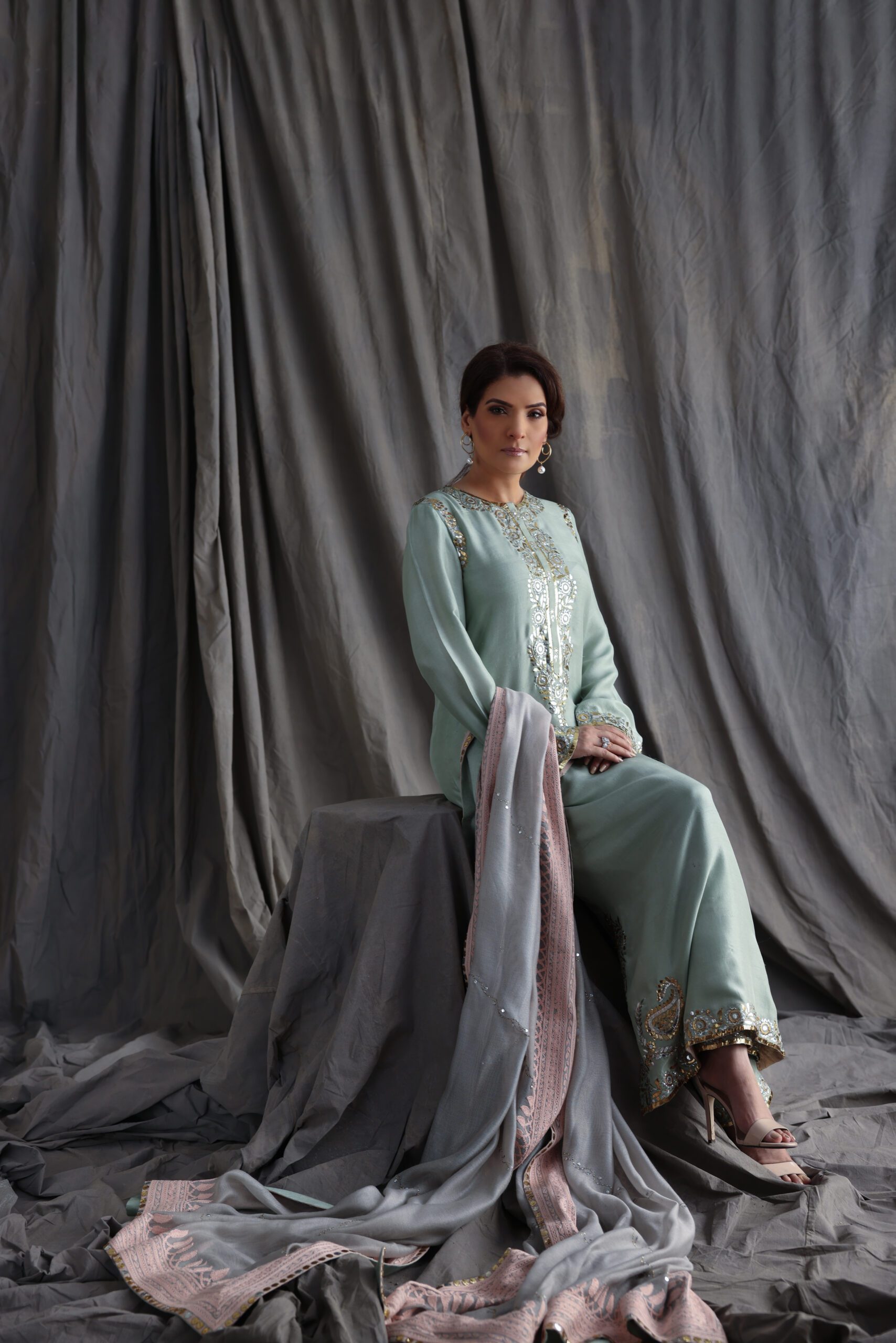 Mint green shirt with golden and silver kaamdani work paired with ijaar and dupatta