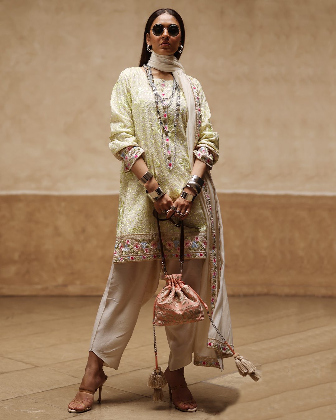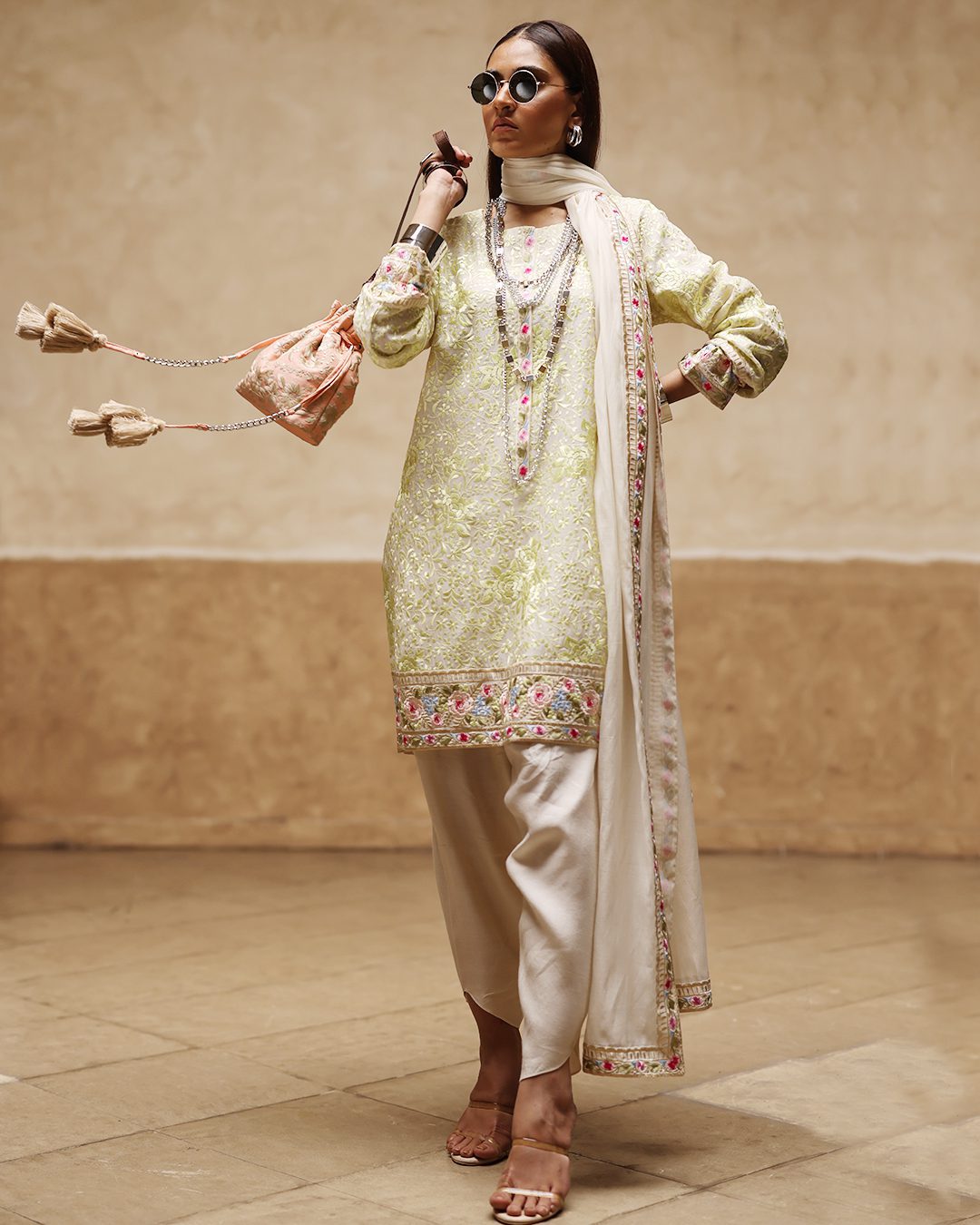 Bottom: Ivory khaddi cotton silk plain assymetrical shalwar
