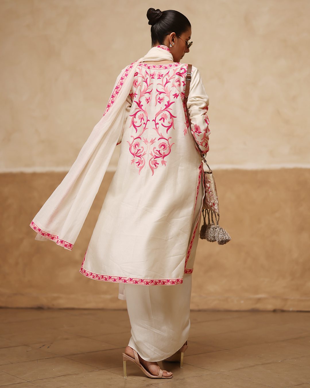 Shirt: Ivory shirt with pink aari embroidery on the neckline, sleeves, chaak and hemline