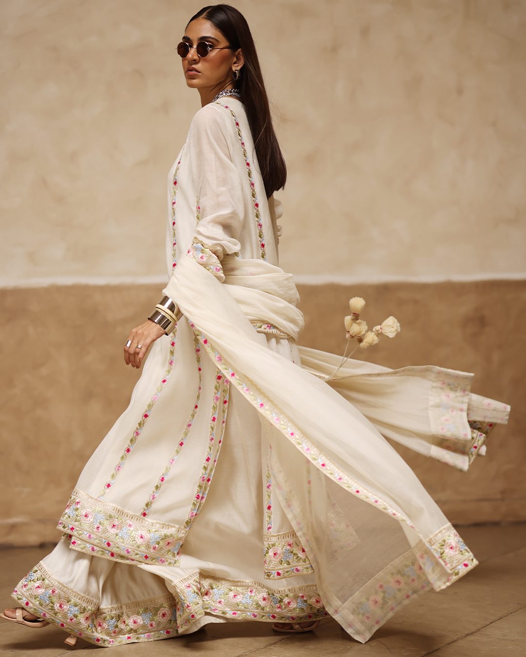 Shirt: Ivory double layered shirt with embroidery on the kalis, sleeves, hemline and button patti on the neckline