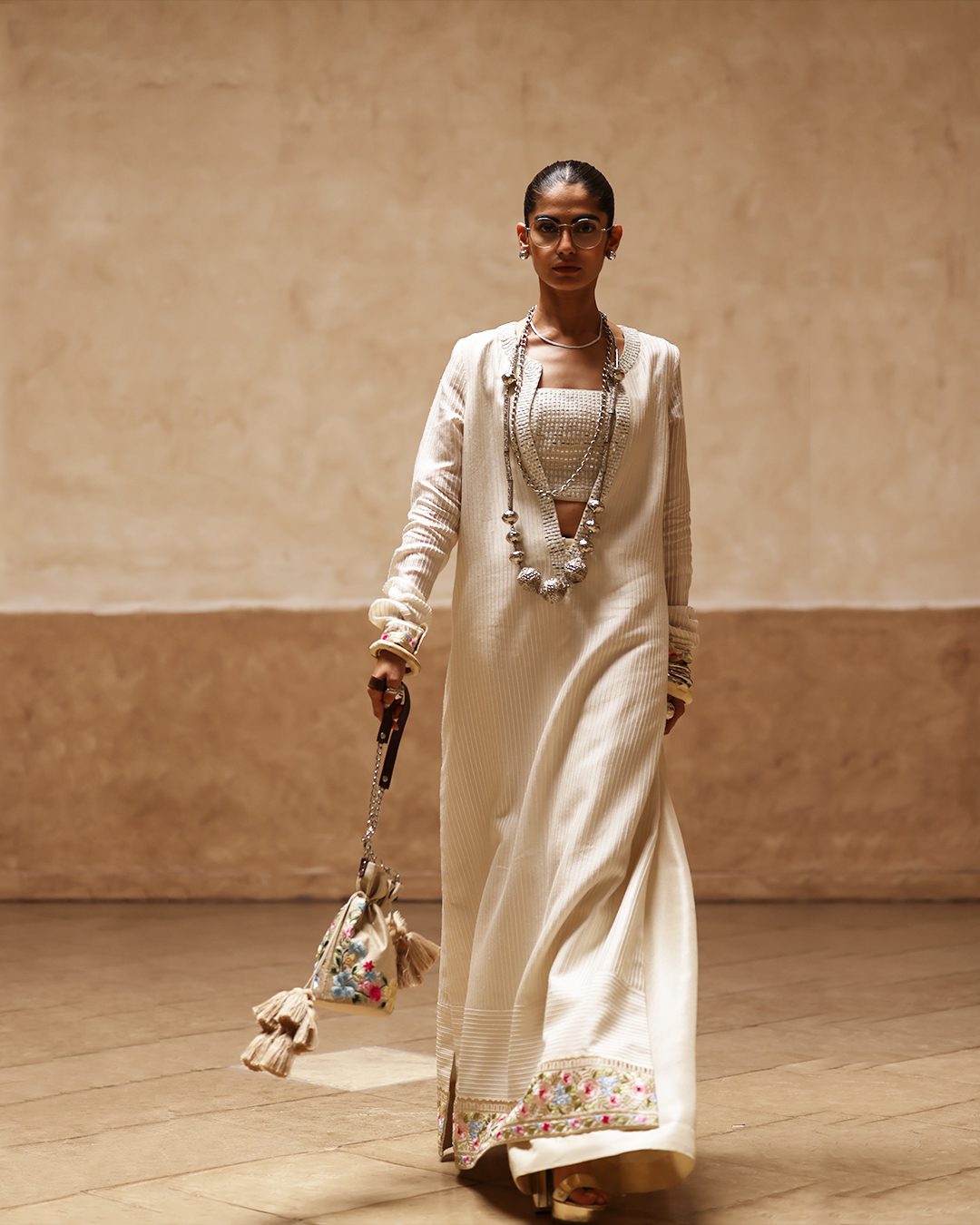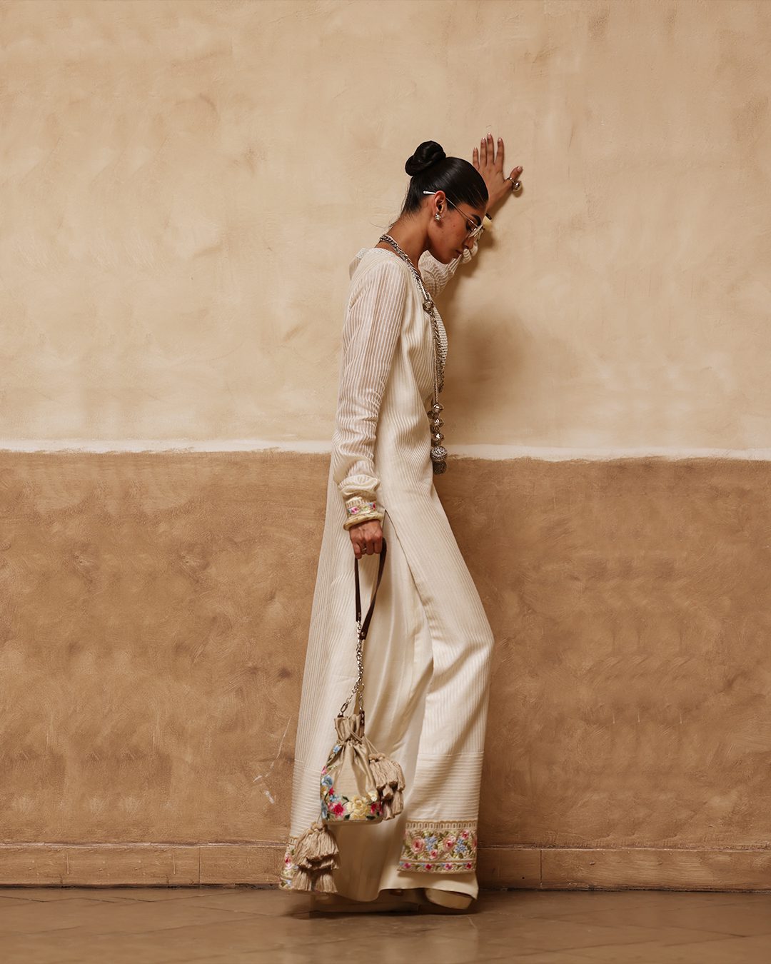 Shirt: Ivory long shirt with striped embroidery in pure maple raw silk and mirror work detailing on the long neckline and embroidered border on the sleeves and hemline with chooridaar sleeves