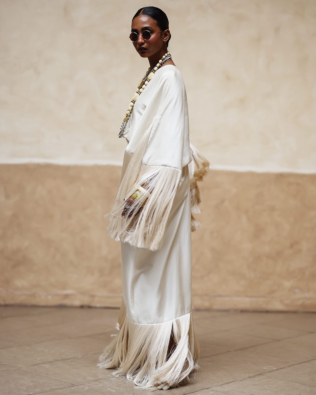 Dress: Ivory long kaftan dress in pure raw silk with tassels