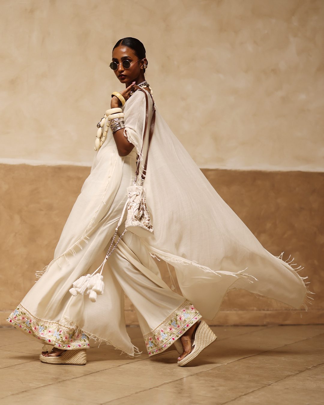 Bottom: Ivory handloom cotton silk flared pants with gara embroidered border