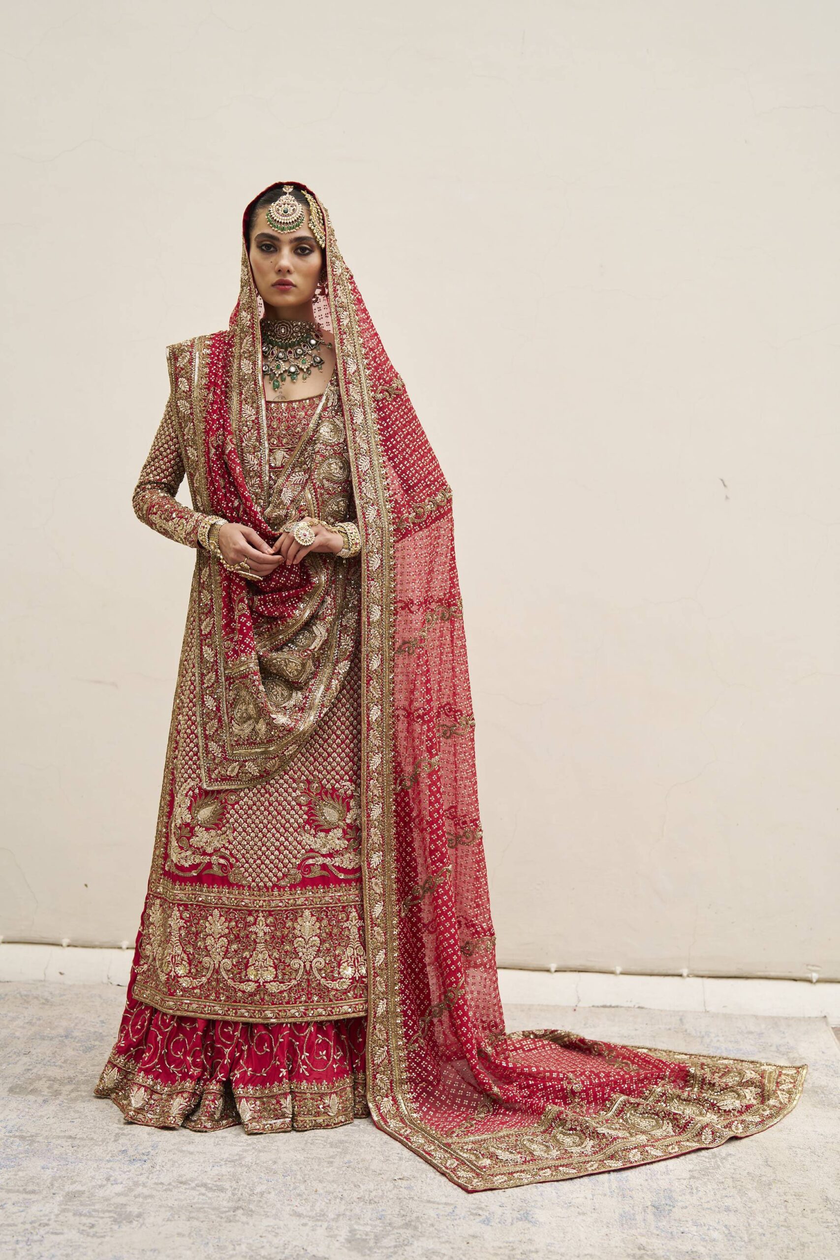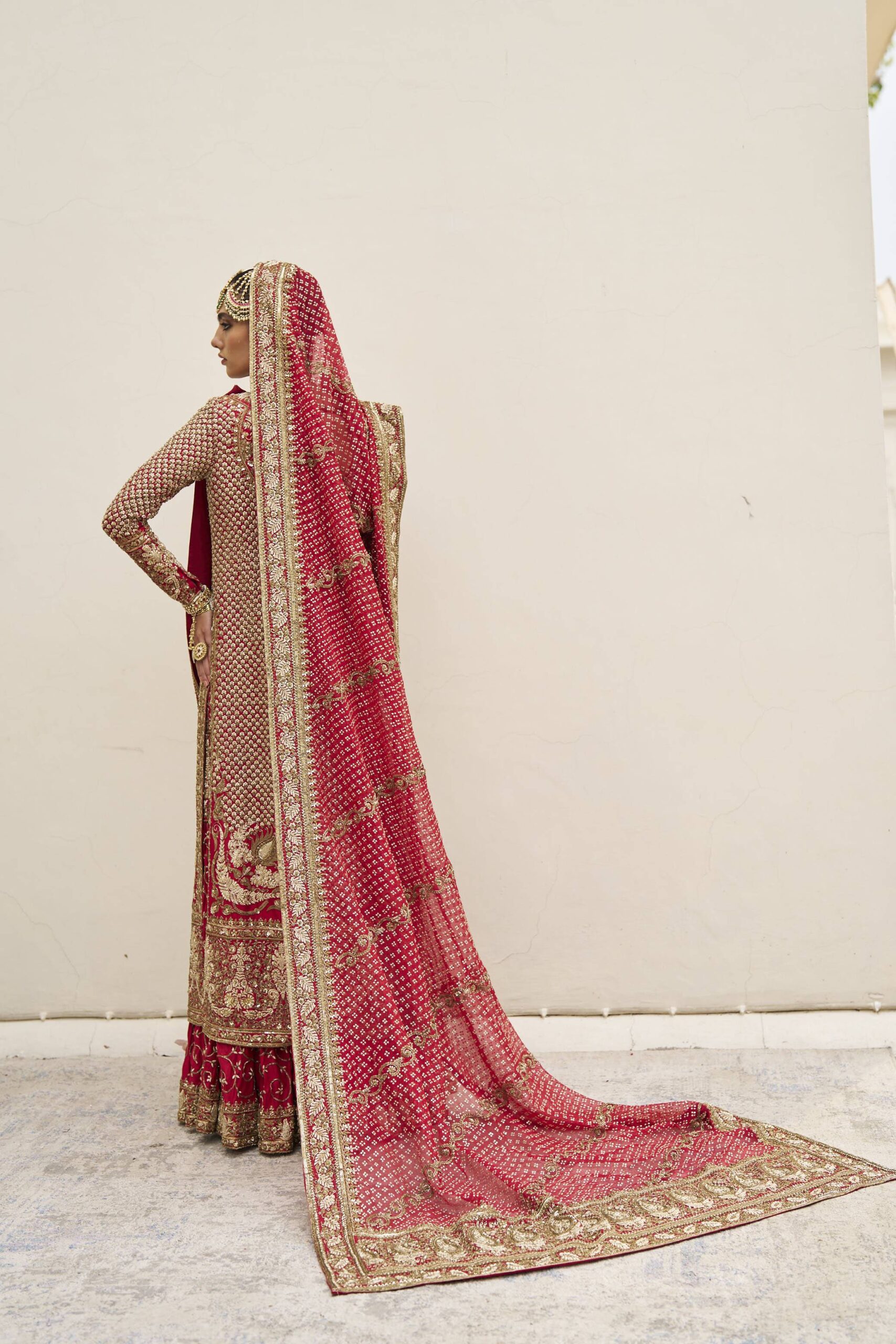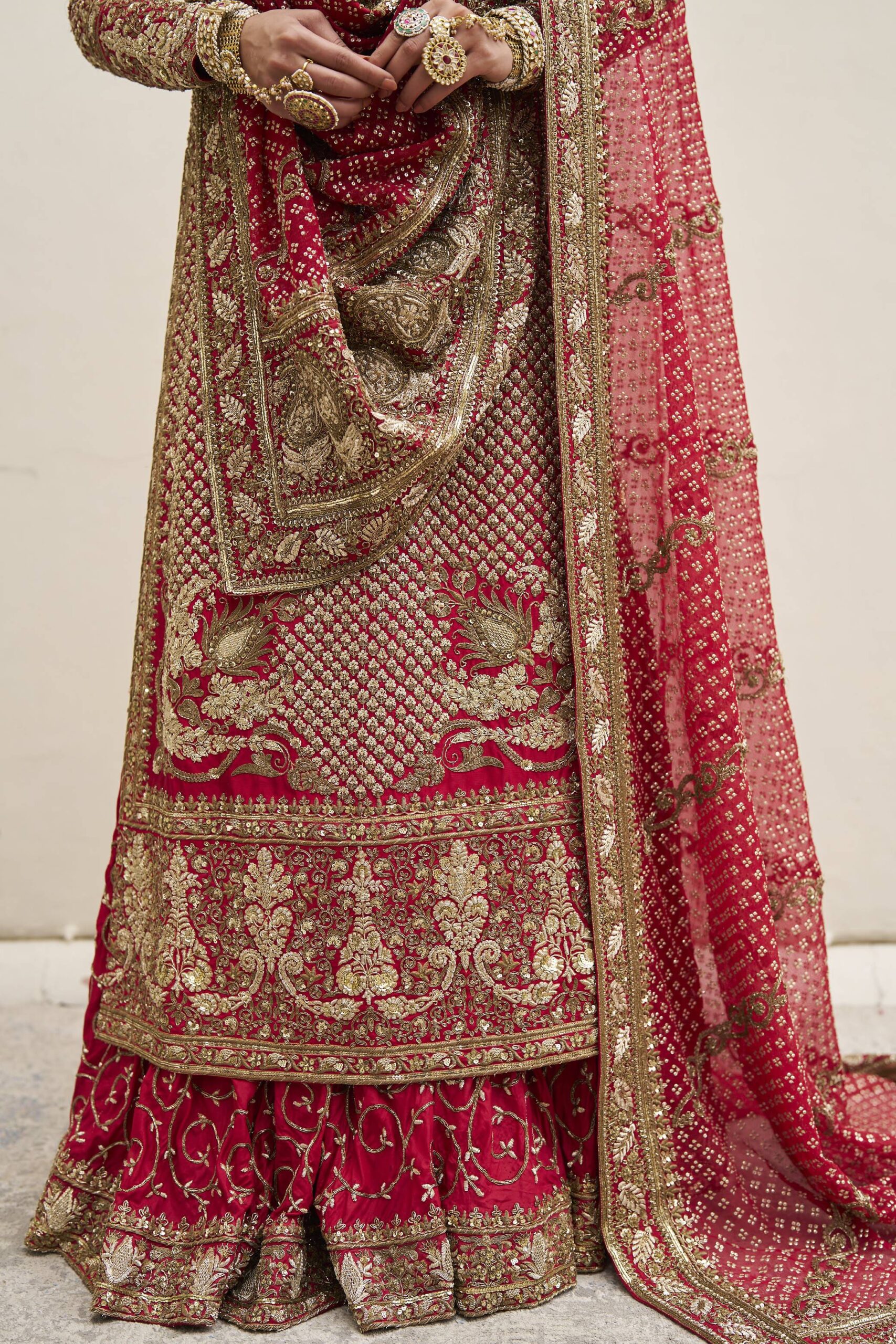 Dupatta: The bright red hue dupatta is fully hand embroidered with techniques of zardozi, dabka, nakshi and sequins work. It has four side borders which are heavily embroidered and diagonal charris of hand craftsmanship. The palloos of the dupatta is embroidered with thick paisely borders. The fabric of the dupatta is net organza. The dupatta is of 4 yards.