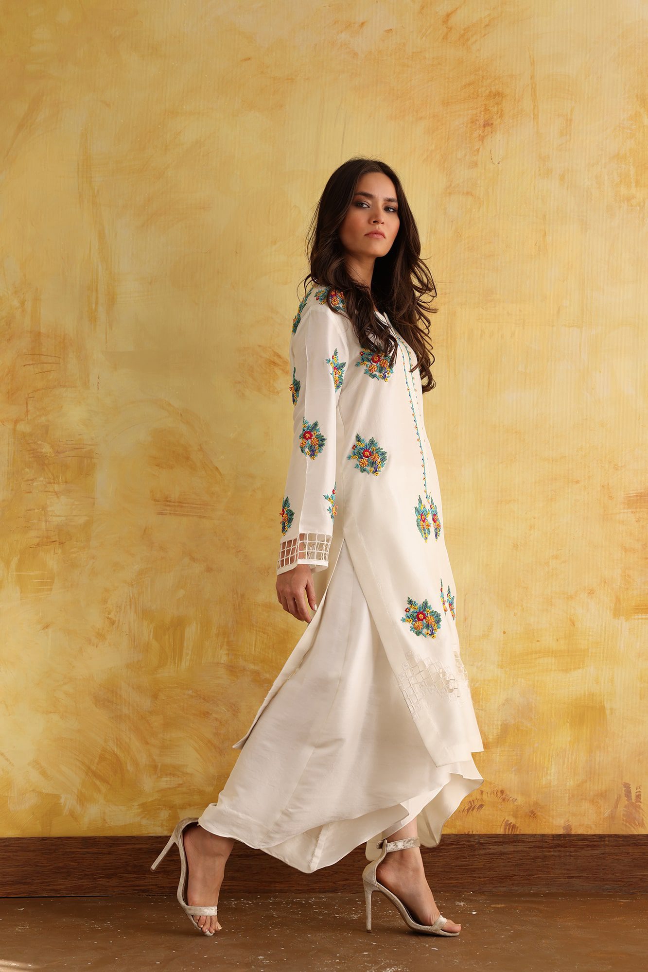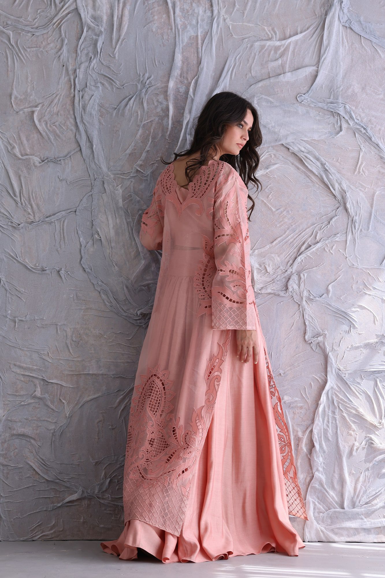 Coral toned long shirt with intricate detailed cutwork paired with a flowy skirt