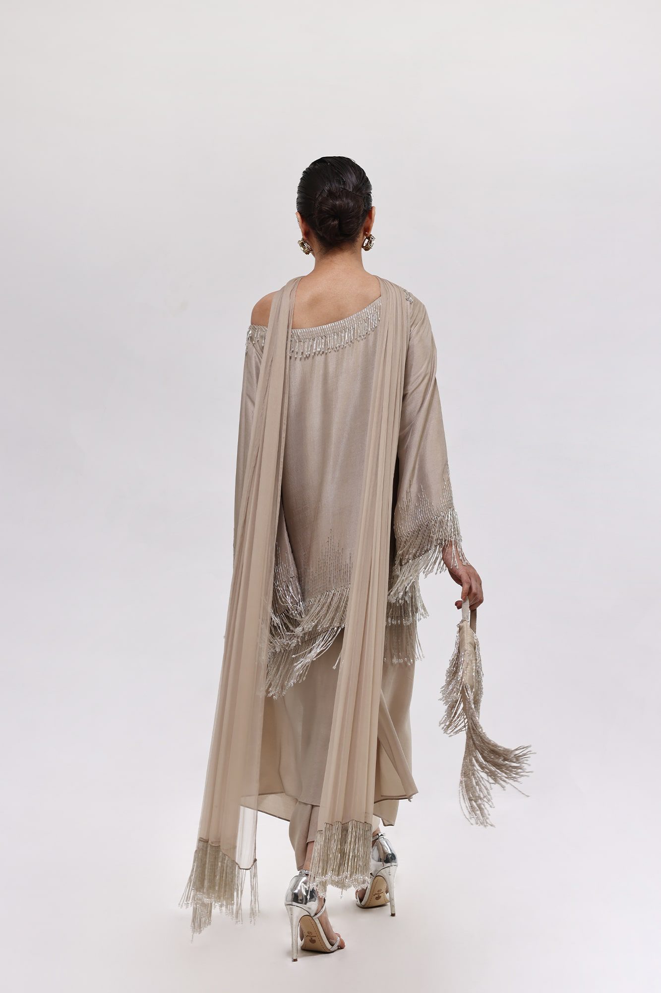Draped beautifully in raw silk, with a beaded fringe embellished A-symmetrical neckline. The attire is further enhanced with an array of beaded fringes along the hem of the shirt, sleeves and duppatta. Paired with a draped dhoti shalwar.