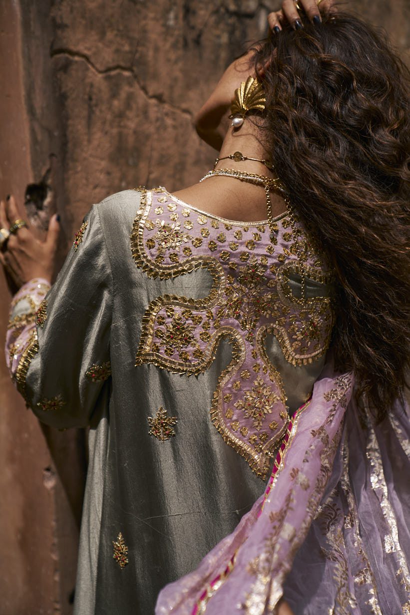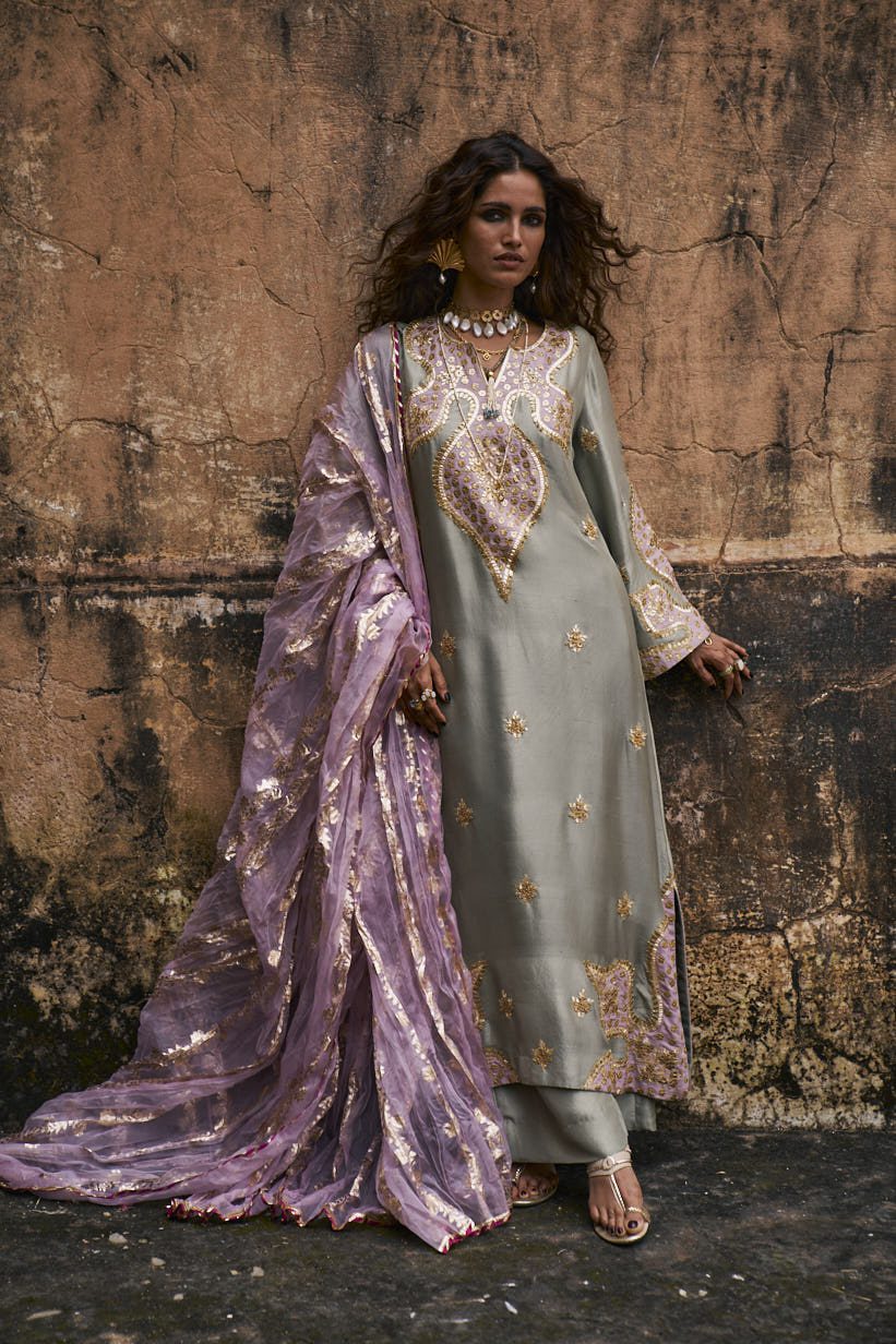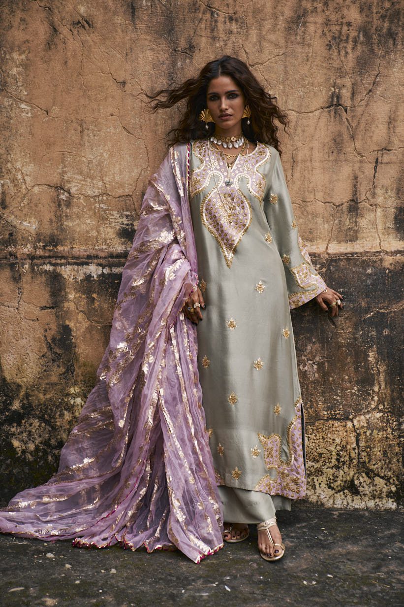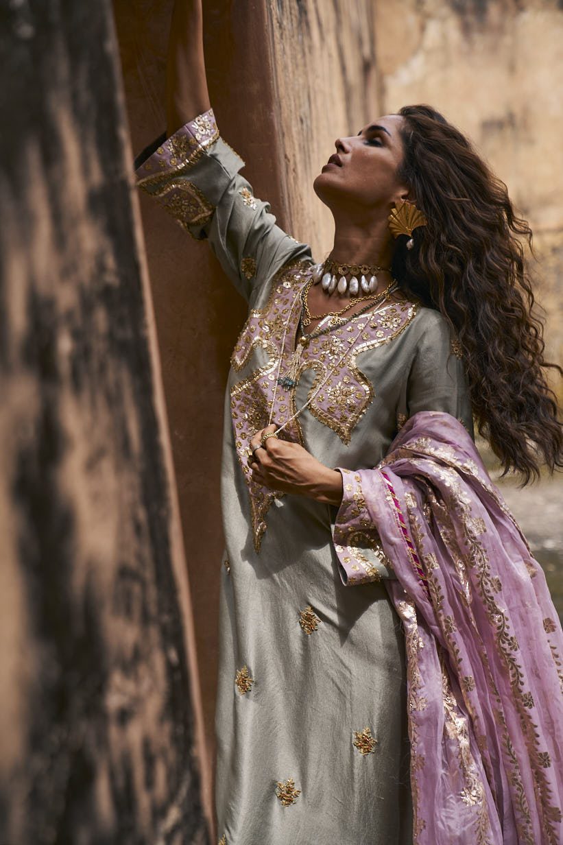 Shirt: Mint green pure raw silk shirt with mauve applique and gota work with small side slits