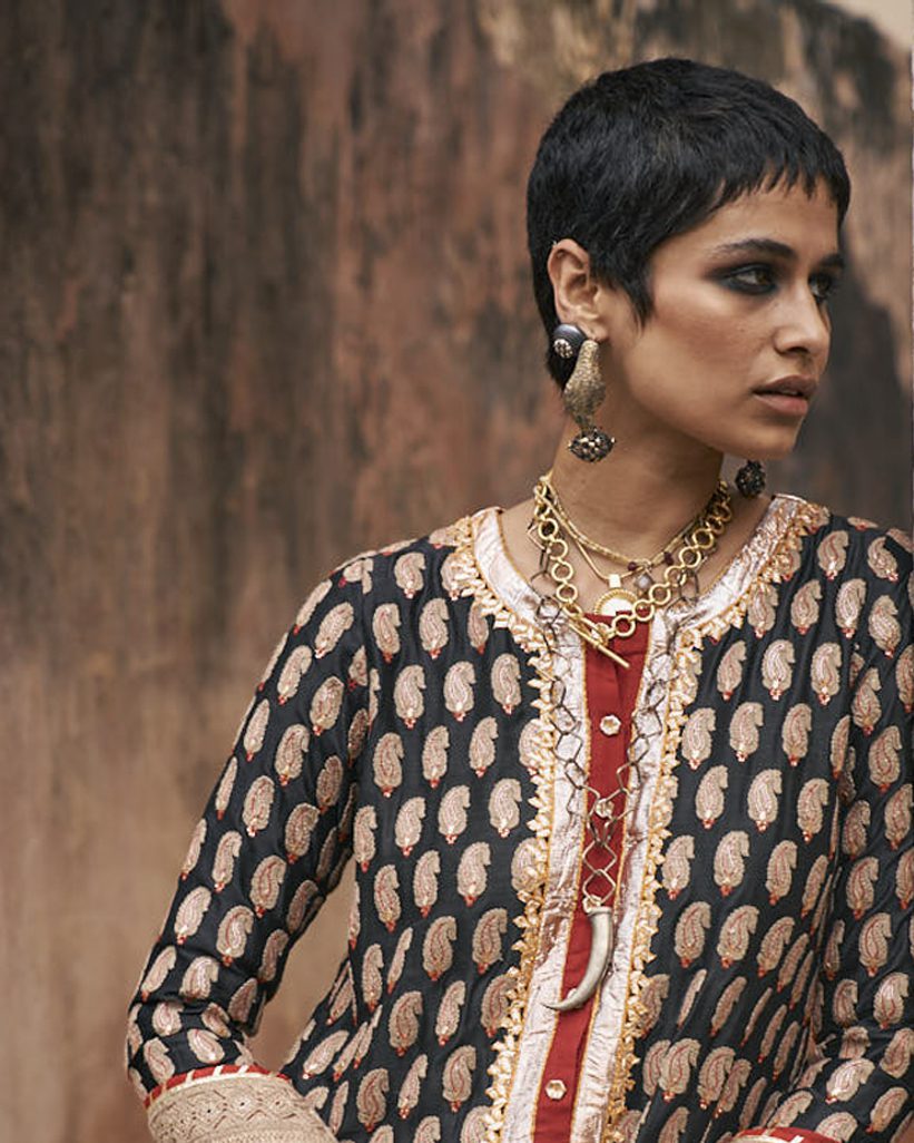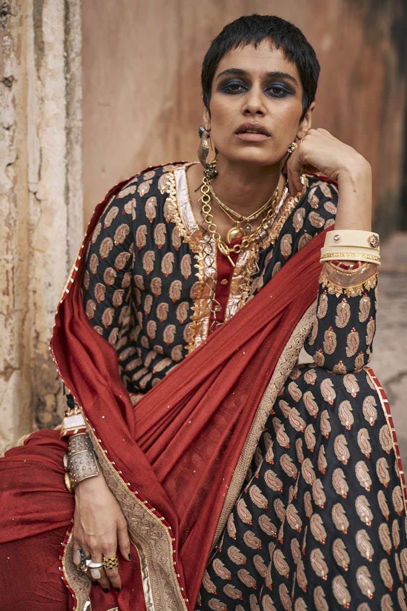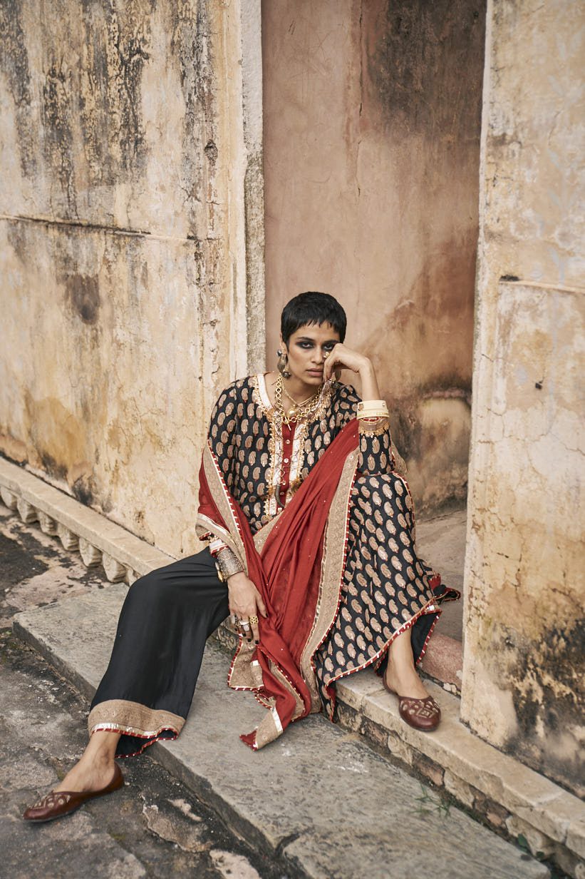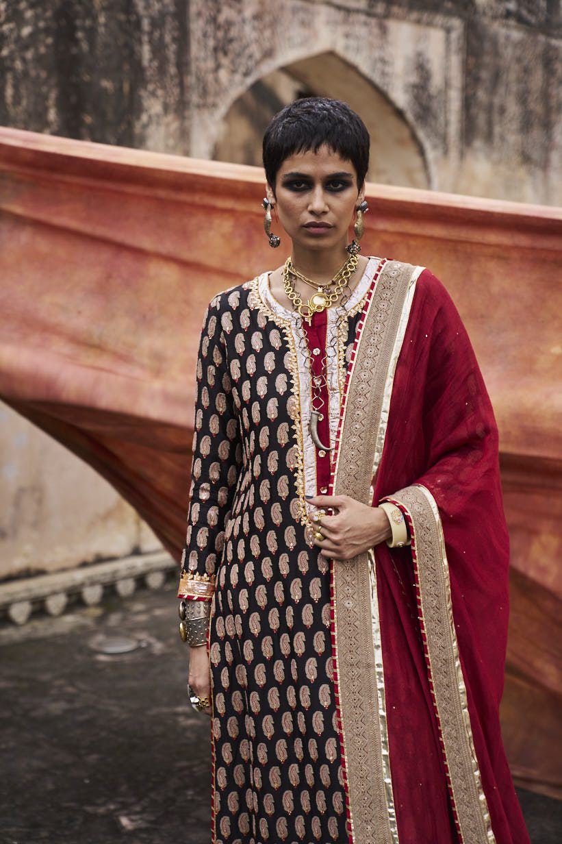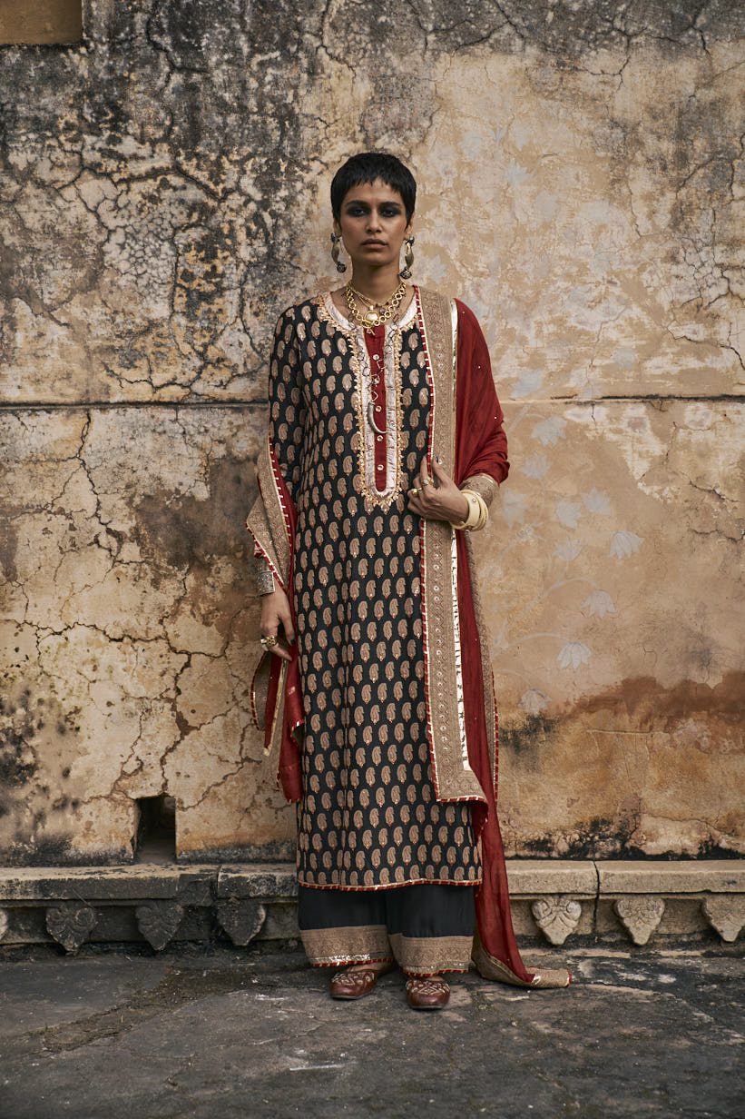 Shirt: Black pure maple raw silk shirt with ari work paiselys and gota work on neckline and sleeves