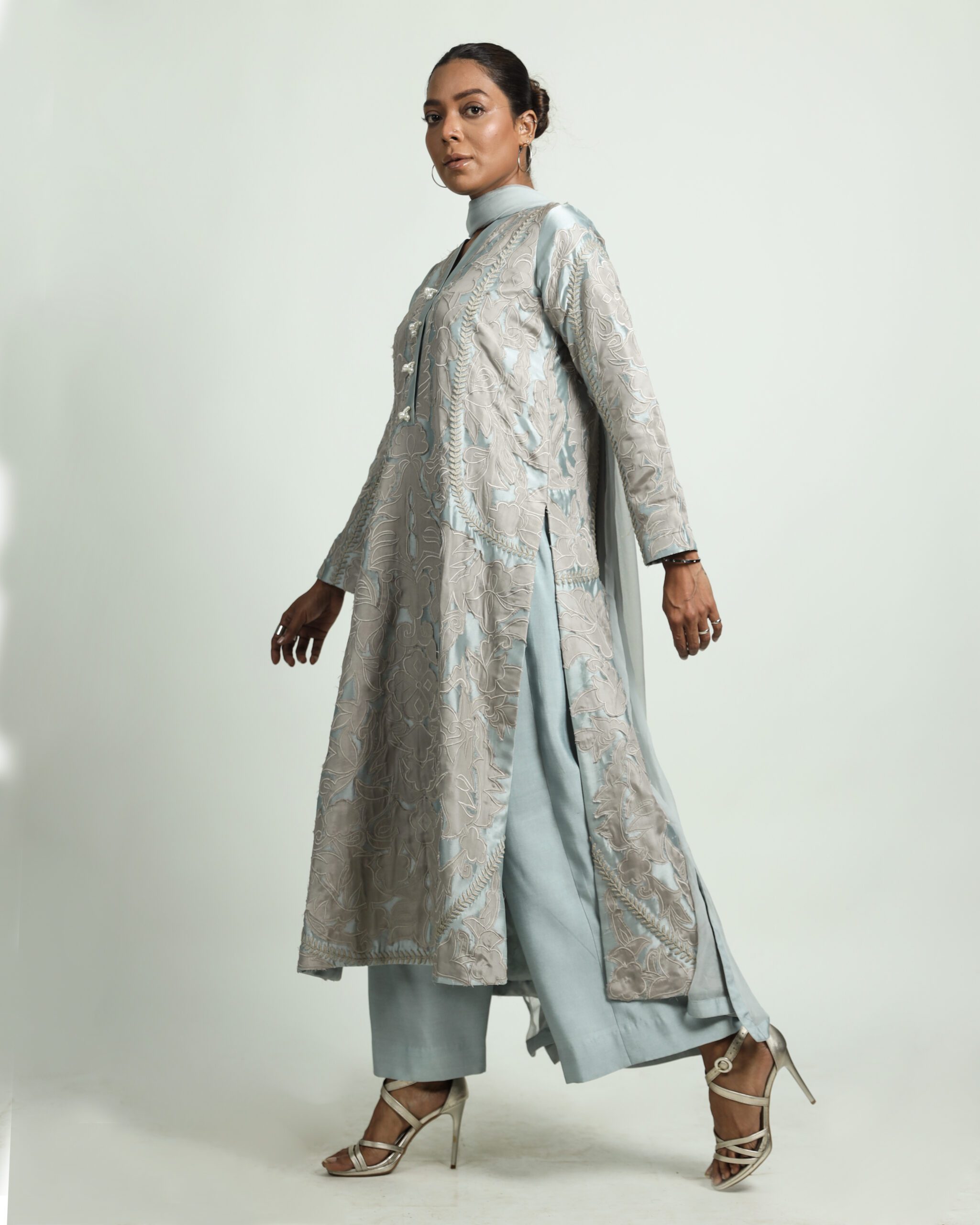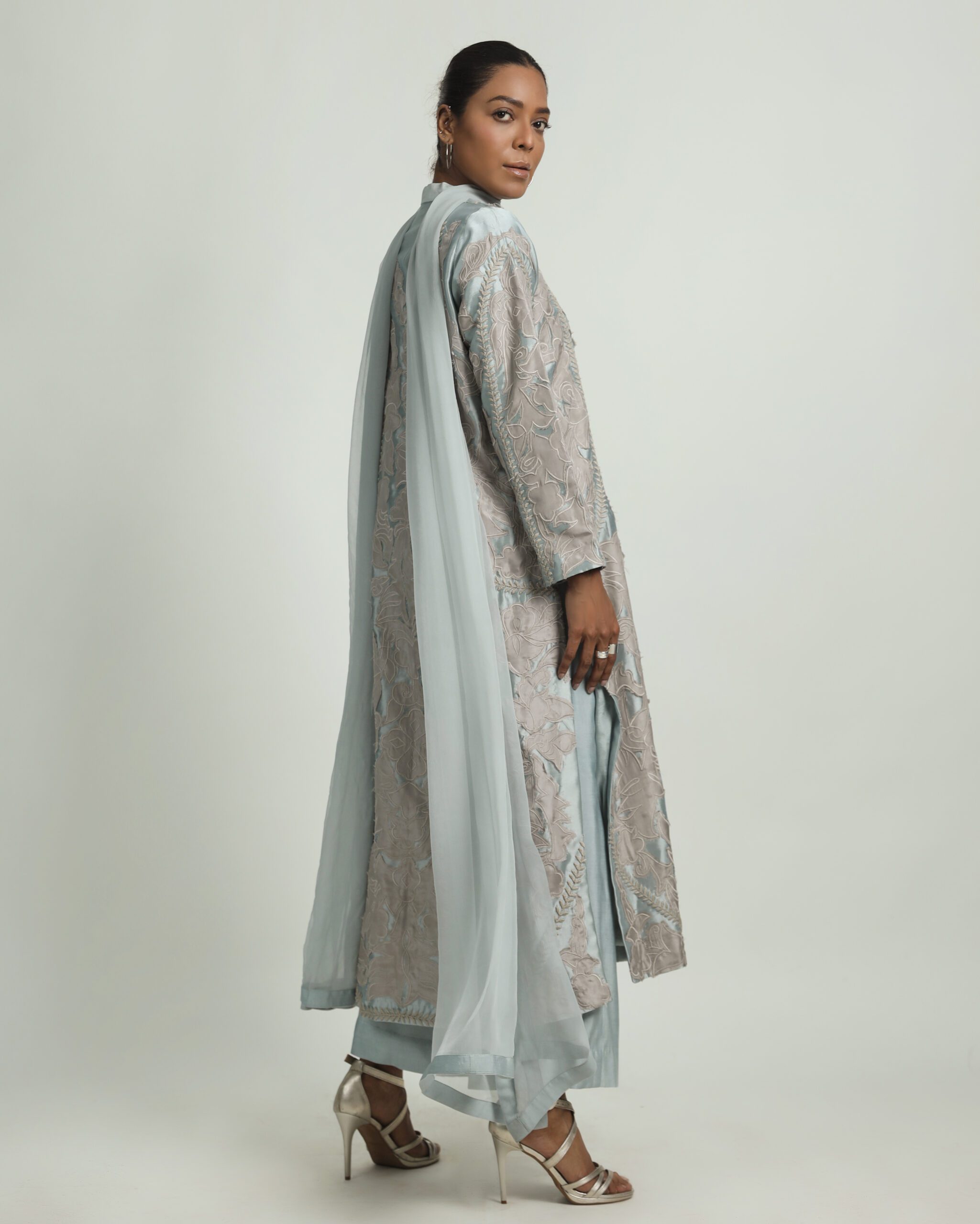 Ice blue/Gray applique shirt rough edge embroidery Ice blue crinkle chiffon dupatta with