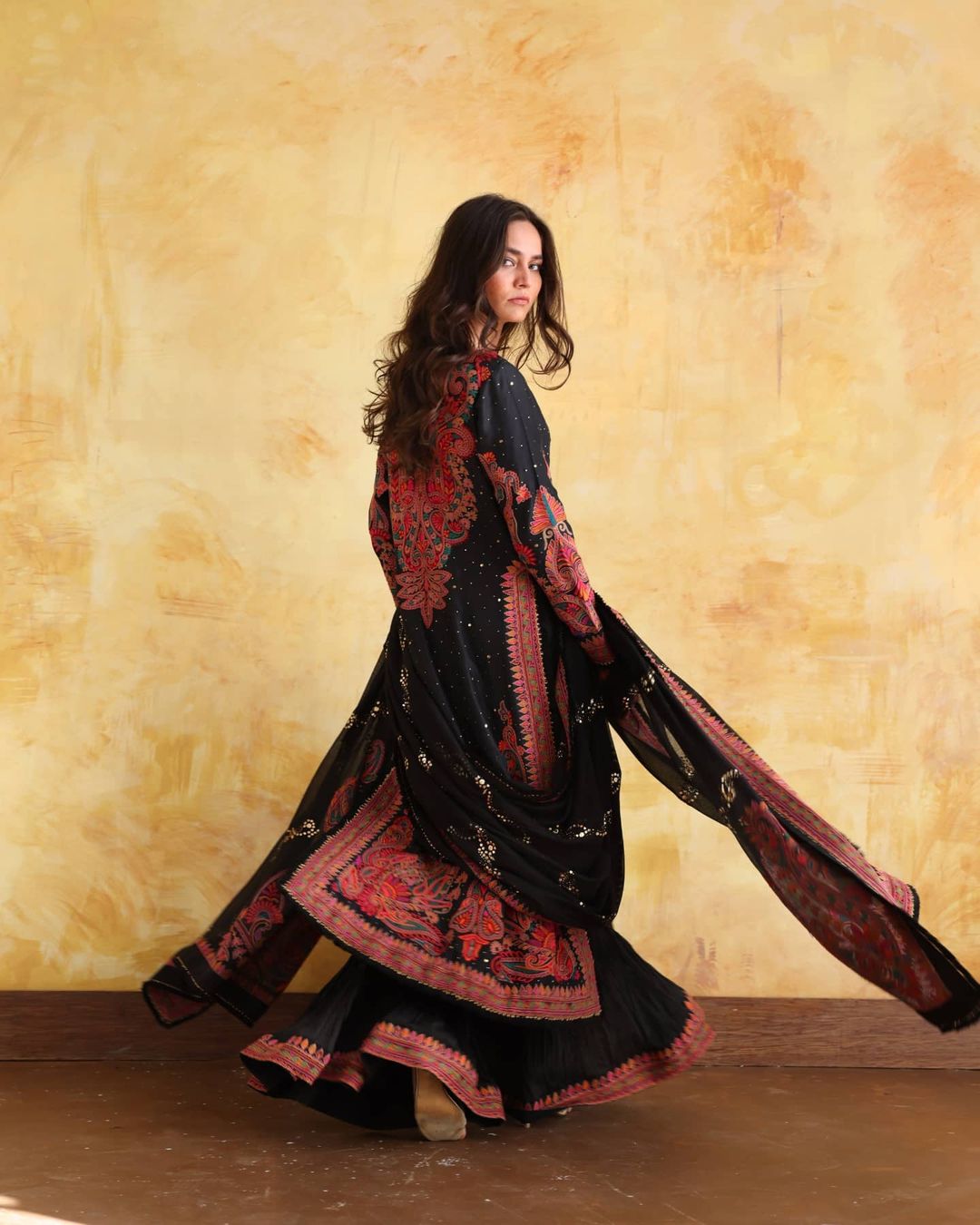 Outfit with intricate thread work in vibrant shades along with kaamdani paired with crushed dhaka pajama and dupatta