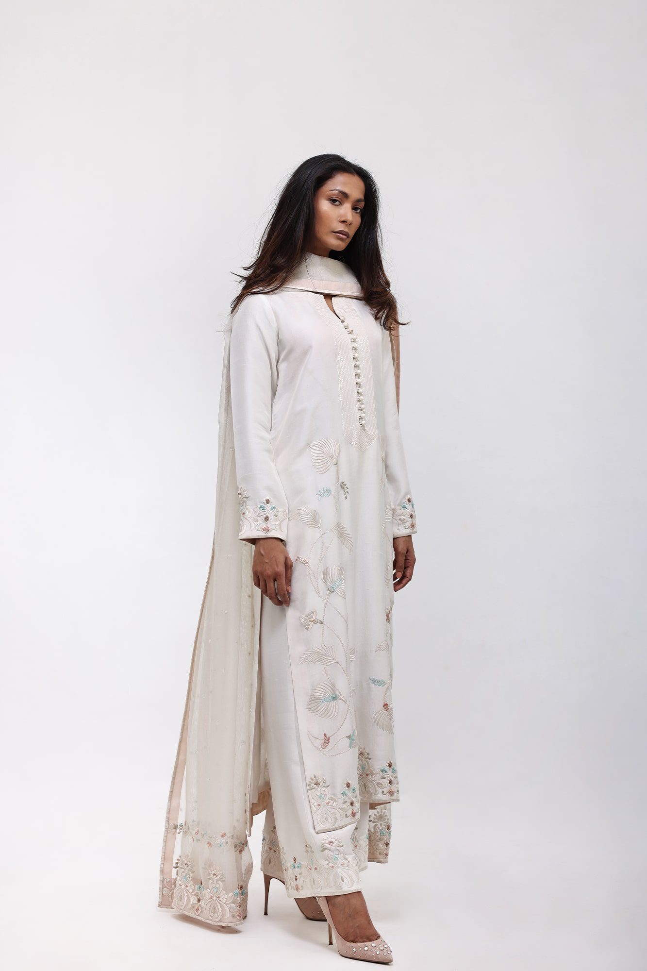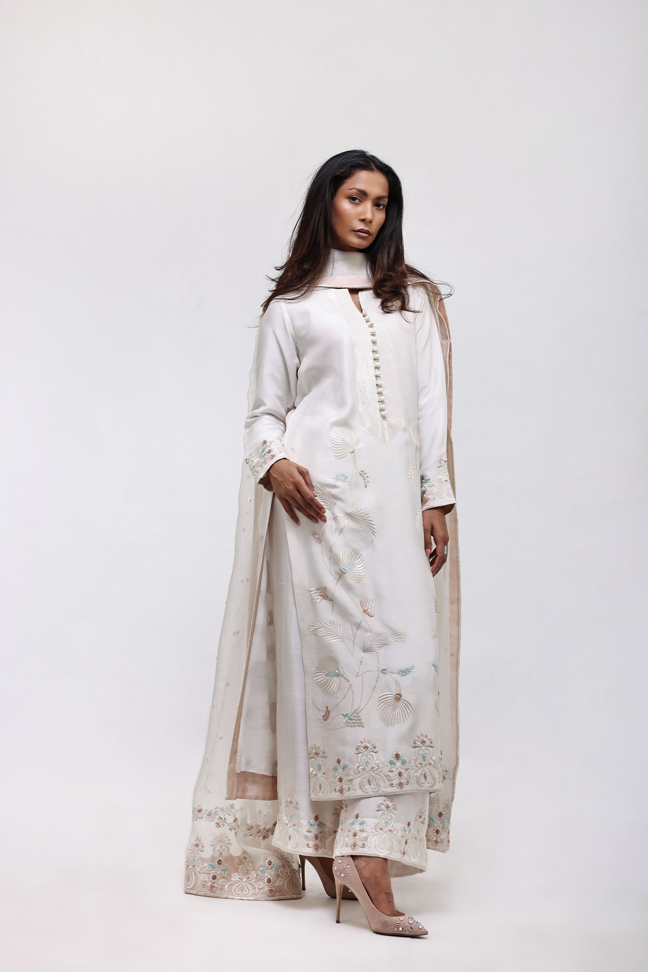 This immaculate white set of 3 consists of a long raw silk kameez paired with culottes, with intricate floral resham work details mixed with french knots and a touch of sequins