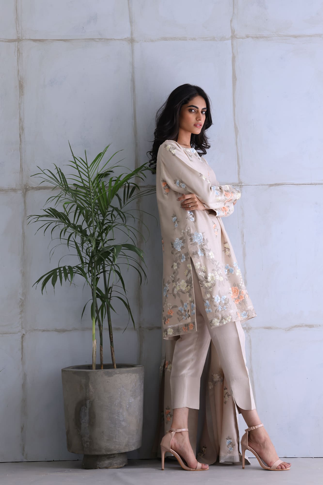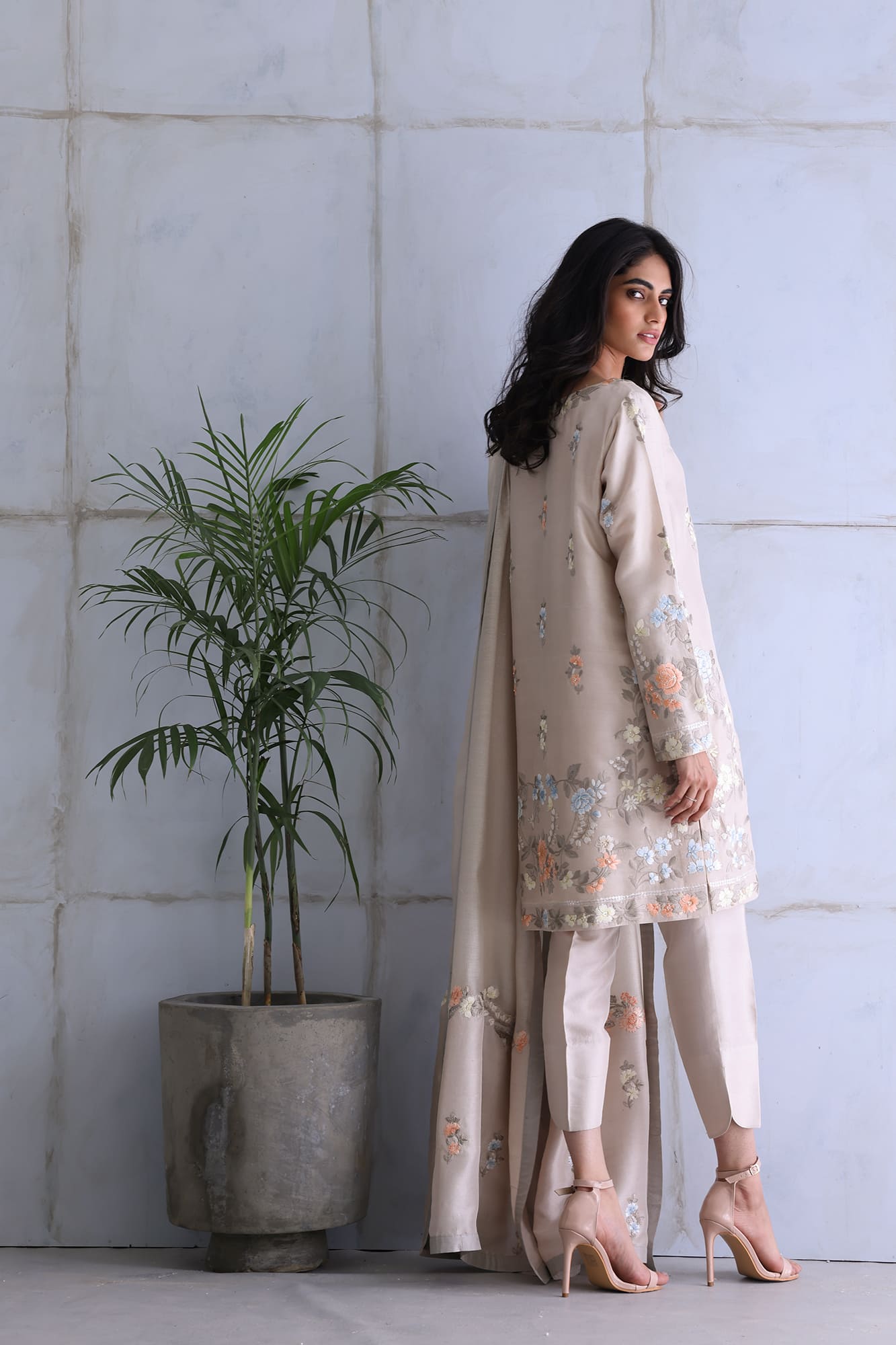 Taupe gara embroidery shirt, paired with pants and dupatta