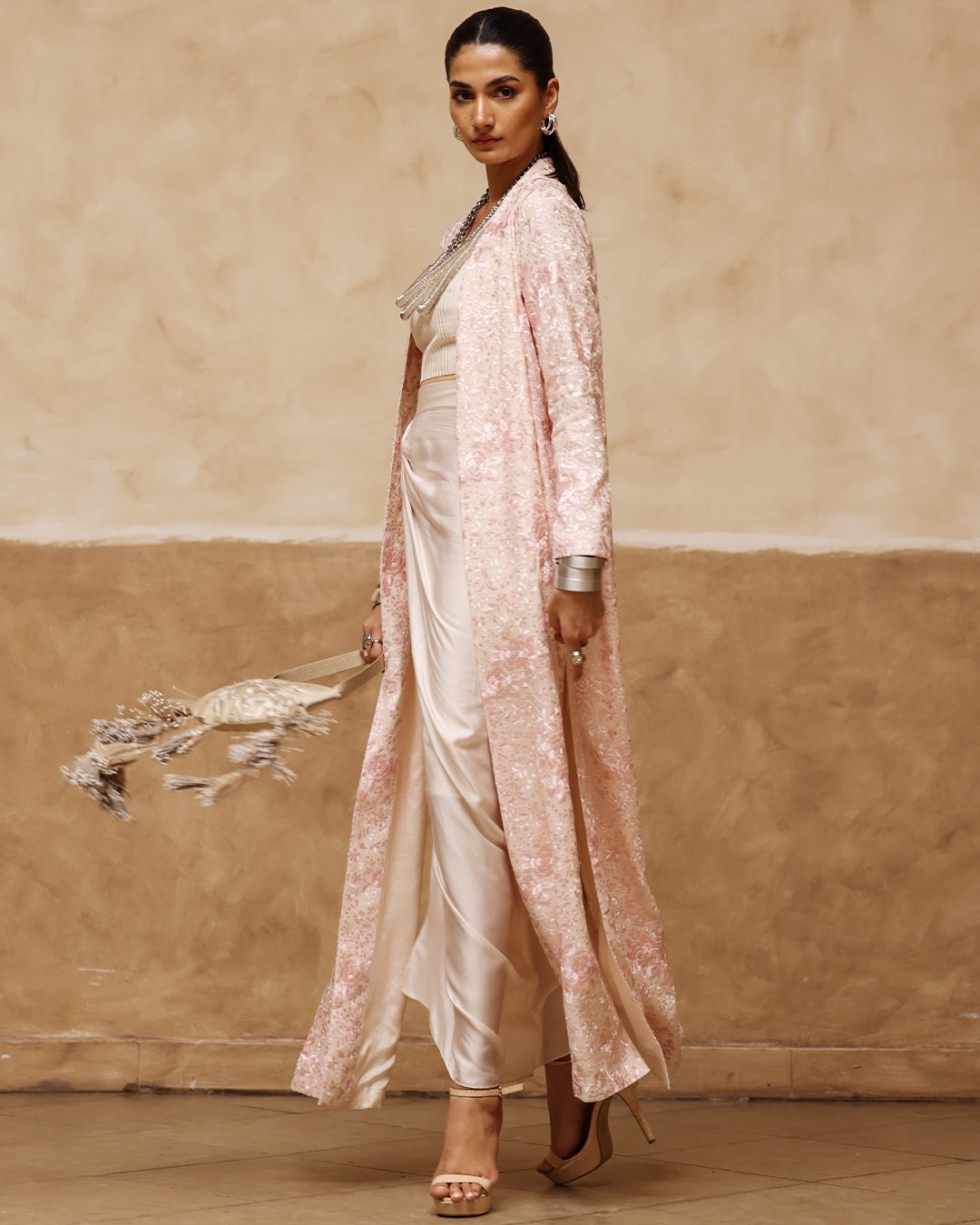Blouse: Ivory striped embroidered blouse in pure maple raw silk