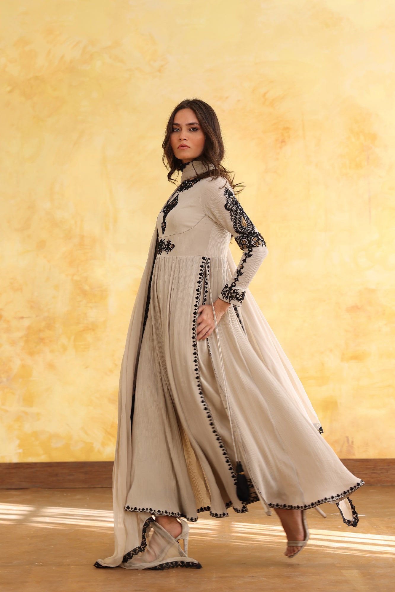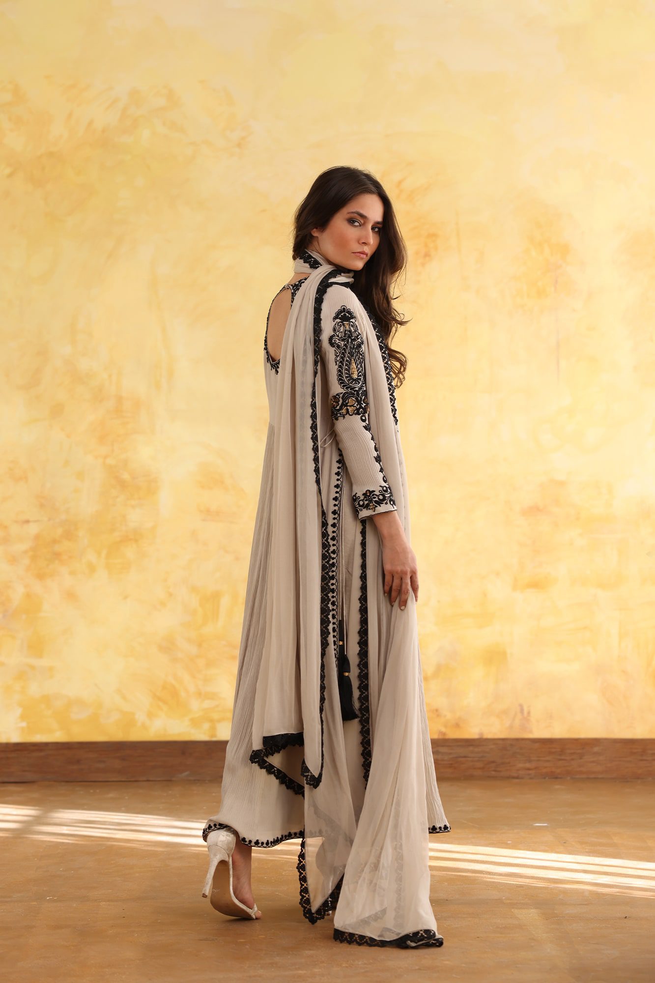 Taupe shirt with black embroidery paired with izaar and dupatta